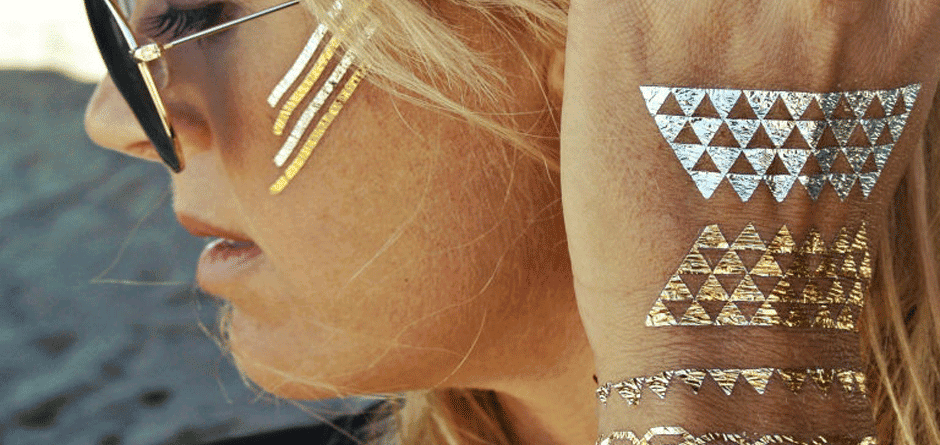 Tο νέο “κόλλημα” του καλοκαιριού είναι τα tattoo σε μεταλλικό χρώμα ή αλλιώς flash tattoo. Χωρίς βελόνες και μελάνια, και χωρίς καθόλου πόνο ή κόπο, μπορείς τώρα να διακοσμήσεις το σώμα σου με τα πιο boho hippy σχέδια, που θυμίζουν κάτι από Ινδία στο πιο chic του. Έχει ήδη ξεκινήσει μα γίνεται χαμός και όσες από εσάς δεν έχετε τολμήσει ακόμη να “χτυπήσετε” ένα αληθινό σχέδιο στο σώμα σας, απλώς δοκιμάστε ένα… flash tattoo. Η χρήση τους είναι πολύ απλή, σε μορφή αυτοκόλλητου, το οποίο σταθεροποιείται στο δέρμα με την βοήθεια του νερού. Τα τατουάζ αυτά φοριούνται σαν κοσμήματα, στους καρπούς αντί για βραχιόλια, στα δάχτυλα αντί για δαχτυλίδια και ου το καθεξής και τονίζουν πολύ το εξωτικό μαύρισμα που ευχόμαστε να αποκτήσεις σύντομα κιόλας. Υπάρχει τεράστια ποικιλία σε σχέδια, μικρά και μεγάλα, μπρονζέ ή ασημένια, τύπου αλυσίδας, φτερά, δαντελωτά έθνικ σχέδια, tribal σχέδια, και ό,τι άλλο μπορείς να φανταστείς. Θα τα βρεις σε καταστήματα με καλλυντικά, αλλά και σε γνωστά πολυκαταστήματα ρούχων.